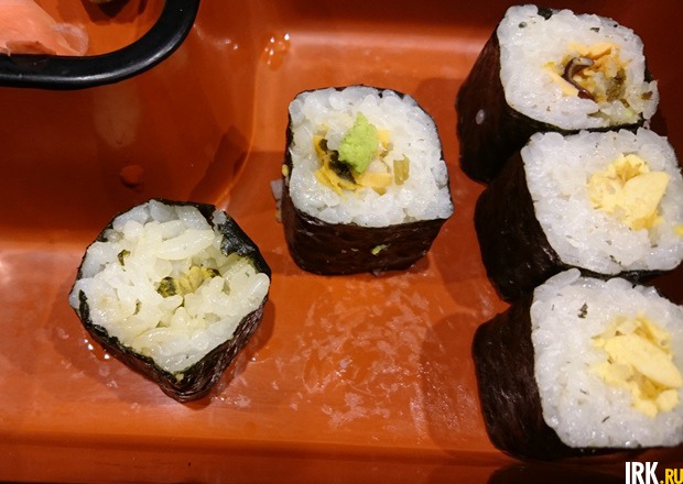 В маленьких, кое-где неаккуратно порезанных кусочках ощущался только вкус рисового уксуса, а присутствие мидий угадывалось только визуально. Ни вкуса, ни запаха морепродукт не имел, что, к сожалению, даже не удивило. Впрочем, традиционные помощники — имбирь, васаби и соевый соус — сделали блюдо съедобным.