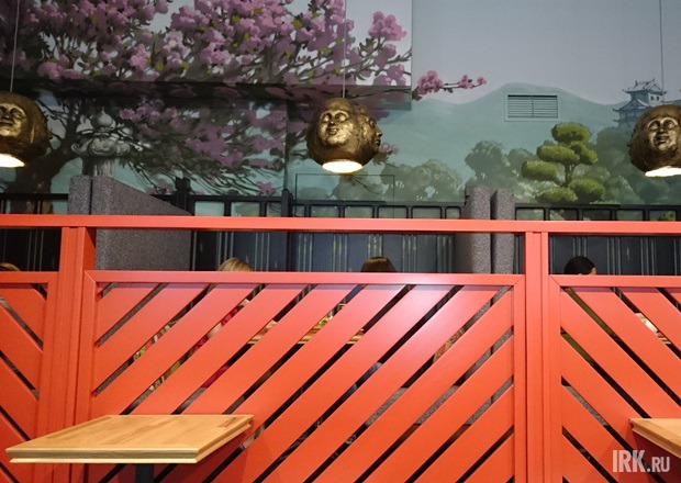 Зашла в «СушиЕд» впервые после ремонта и была приятно удивлена уютной обстановкой. Длинный зал, по периметру которого расставлены светло-серые диванчики и деревянные столики, оформлен в легких, бархатистых и приятных глазу тонах. На золотистых лампах вылеплены человеческие лица-маски (отсылка к знаменитому театру «Кабуки»), с потолка свисают бумажные журавлики. Симпатично обустроено пространство, единственный, но чрезвычайно ощутимый его минус — теснота. Во время моего визита помещение было пустым, но легко представить, как при полной занятости посадочных мест гости будут буквально упираться друг в друга локтями. Намек на уединение есть только у 7 столиков, они разделены мягкими перегородками и ширмой.