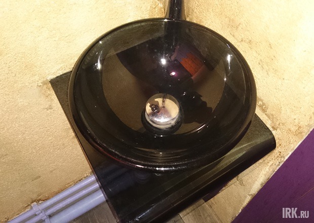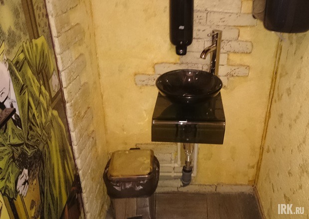 Комната, как и все заведение, выдержана в «лофте», простом и очень лаконичном стиле: кирпичные, выкрашенные в разные цвета стены, практичная мебель и несколько очень милых ненавязчивых деталей, главной из которых является красная телефонная будка. Она с секретом: дверь внутри, противоположная входу из зала, ведет в уборную. Обстановку там я оценивать не стала, но туалеты, относящиеся к основному залу, подпортили впечатление: недостаточно чисто, унитаз и раковины помыты как попало, очень тесно.