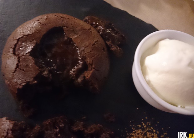 Этот десерт теперь буду рекомендовать всем. Выглядит он не сногсшибательно, но вкус любители шоколада должны не просто оценить, а хлопать в ладоши и урчать от удовольствия. Мягкая начинка из белого и молочного шоколада покрыта глазурью из темного, да еще и сдобрена горячим шоколадным соусом. В общем, шоколад на шоколаде сидит и шоколадом погоняет. Пишу и мечтательно закатываю глаза. Прекрасно, шесть. Да, и не путайте в меню с обычным шоколадным муссом. Его мы тоже попробовали, он сильно проигрывает по вкусовым качествам муссу «bbb».