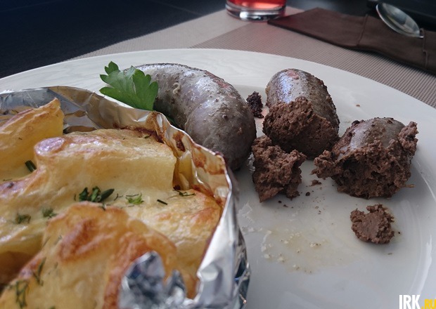 Название, конечно, смутило, но любопытство взяло верх. О таком блюде я ранее не слышала. Оказалось, что это фарш из потрохов, сваренный в кишке или в желудке. На вкус как хорошо прокрученная печень, кожура жевалась плохо. Второй раз не заказала бы, хотя, думаю, любители у блюда найдутся. Зато картошка выглядела очень аппетитно и была весьма вкусной, мягкой и ароматной, с хорошо поджаристой корочкой из сыра и майонеза.