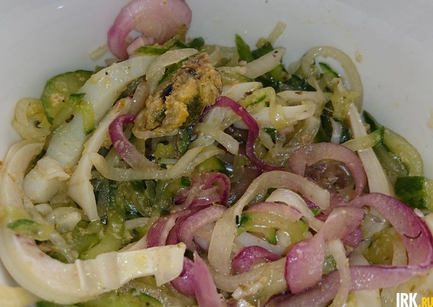 Салат с кальмарами, мидиями, редисом дайкон и огурцом