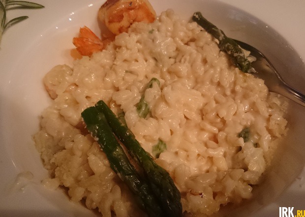 Вкусное ризотто с крупным рисом арборио, обилием бульона, сливочно-сырного соуса и мясистыми кусочками креветок. Правда, блюдо желательно есть быстро, ни на что не отвлекаясь, пока оно горячее. Остывая, рис начинает склеиваться и теряет всю прелесть.