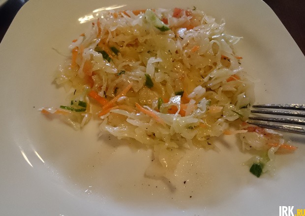 Захотелось мне похрустеть капусточкой, хотя позже подумала, что интереснее было бы выбрать «Обжорку». Хорошая малосольная капуста с морковью и огурцом. Не раскисшая, упругая и вкусная, порядочно сдобренная подсолнечным маслом, которое некрасиво растеклось по тарелке, пока ее несла официант. Да, подача блюд в кафе хромает.