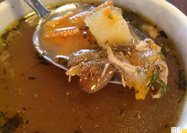 Почему-то его принесли первым. Хороший грибной бульон с тонкими кусочками курицы, свежим укропом, в меру мягким картофелем и морковью. Овощи предварительно обжарили, поэтому, кроме навара от мяса, жирность супу придавало масло. Вообще — хороший такой домашний суп.