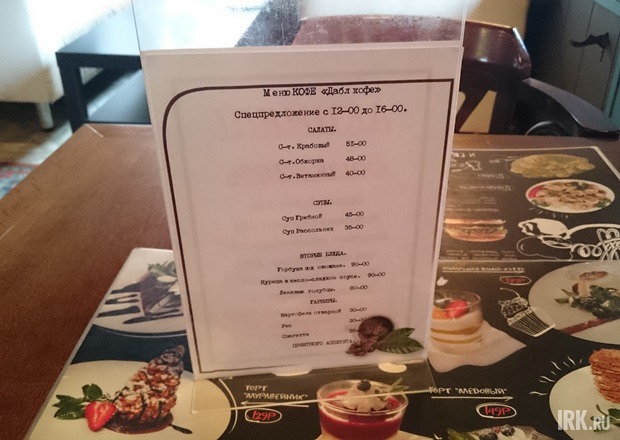 Обстановка в «Дабл кофе» простая, даже небрежная: заляпанные зеркала, потрепанные ковры, поцарапанная мебель, затхлый запах. Впрочем, все это не имеет никакого значения во время стремительного бизнес-ланча. Вижу кнопку вызова официанта – нажимаю. Передо мной довольно быстро появляется запыхавшаяся девушка, не представляется, естественно, — не до того. Получив меню бизнес-ланча, я его некоторое время изучаю.