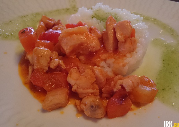 Опять блюдо оформили как попало: как будто с большого расстояния в тарелку шмякнули сначала мясо, потом соус — все разбрызгалось и разлилось. Но тем не менее, было вкусно: мягкое куриное филе с ананасами и перцем (я сама так готовлю иногда), рис с чесноком и… маслом. Не знаю, зачем повар везде его добавляет.