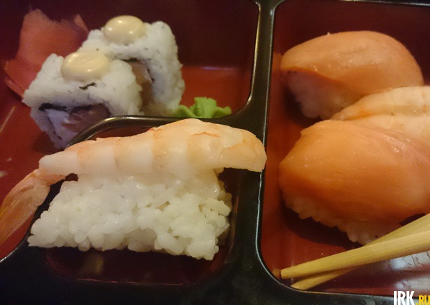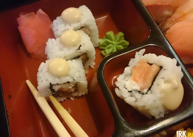 Роллы понравились, хоть и чувствовалось, что их приготовили не только что. Внутри монолитной массы из риса была сочная рыба со вкусом рыбы (что, знаете ли, редкость) и сливочный сыр. Сверху капля горчичного соуса. Рис на вкус приятный, в меру клейкий, в меру рассыпчатый с приятной ноткой уксуса.