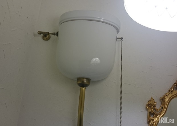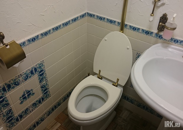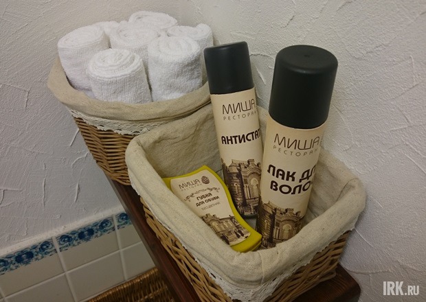 И пара слов о туалете. Его тоже постарались стилизовать: плитка под гжель, ручка для смыва на цепочке. Не хватало только кускового мыла, но оно, говорят, запрещено по нормам СанПиНа. В плетеной корзинке – брендированные лак, антистатик и губка для обуви — популярная фишка в ресторанах сейчас.
