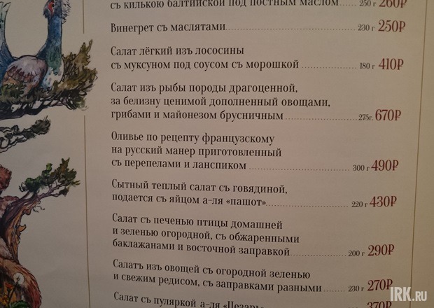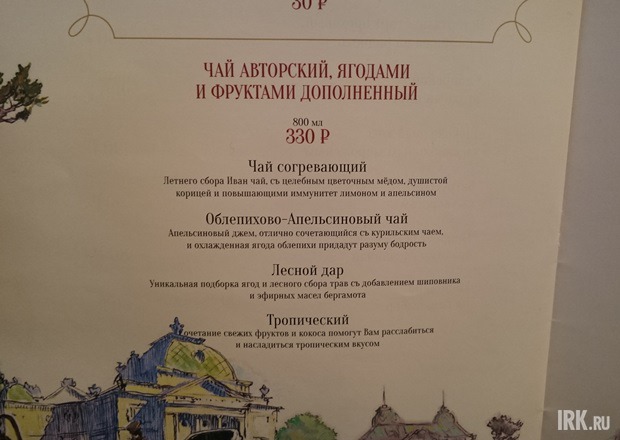 Есть в ресторане «Миша» и специальные уголки с фотографиями иркутских купцов и меценатов, связанных с историей города, и рисунки Иркутска, сделанные со старых фотографий. «Хотим просвещать горожан,» — объясняет мне девушка в черном, хотя с трудом смогла рассказать и про половину картин.