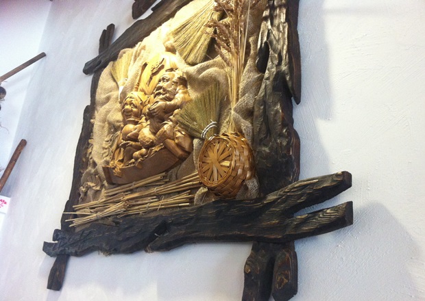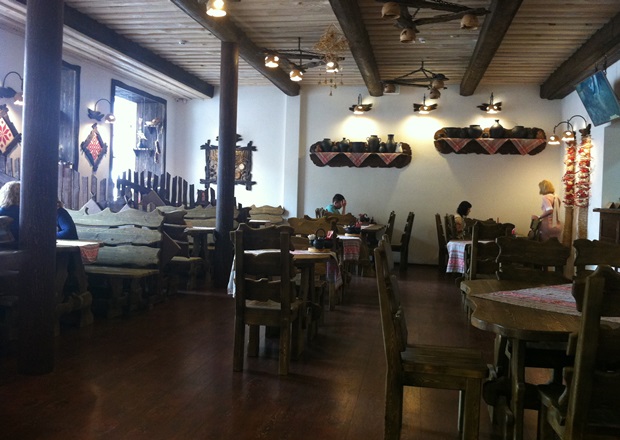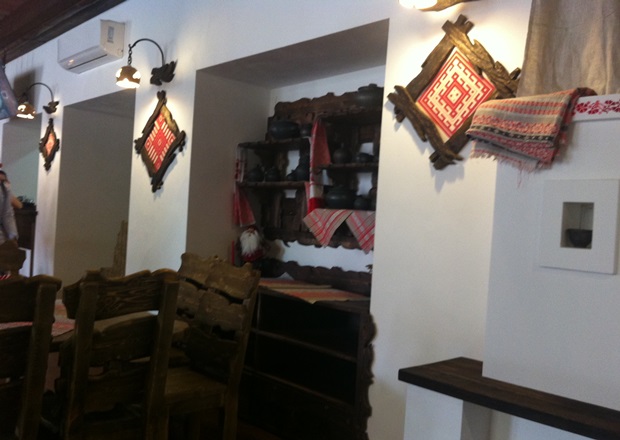 Выкроив обеденное время одного буднего дня, прихватила подругу и направилась в «Беларускую глебу». Много любопытных деталей выставлены прямо перед окном: ступка, колесо, телега и другие предметы быта — чтобы гости видели, что тут все не просто так, тут атмосфера. Да, когда вошла внутрь, первые впечатления были положительными. Открытый просторный зал оформлен в стиле белорусской избы. Приятный запах свежего дерева, те самые горшки, кувшины и чашки из гончарной мастерской расставлены по полкам и внутри подобия славянской печи, всюду рушники с орнаментами, льняные салфетки, коврики, картины и поделки из соломы, официант в белой расшитой рубахе и фартуке, белорусская музыка фоном (фолк и известные хиты типа «Родина моя Белоруссия») — все это, конечно, создает приятное ощущение уюта и хорошей такой самобытности. Понравилось, что здесь прохладно и что столы располагаются достаточно далеко друг от друга, гостям комфортно: никто не является невольным свидетелем чужих разговоров.