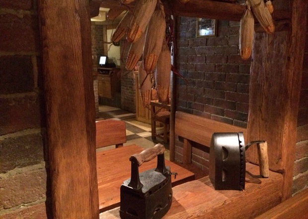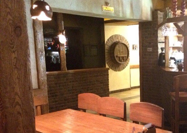 Пока ждали первые блюда, у нас появилась возможность осмотреться. В ресторане три зала. Первый зал проходной, поэтому показался нам неуютным. Столы, расставленные по углам и вдоль стен, отсутствие интересных деталей укрепили наше мнение. Другой зал, с танцполом, на момент посещения был пустым и не функционировал. И последний, в котором мы остановились, оказался более теплым, домашним и приятным. Интерьер вполне оправдывается тематикой заведения — много дерева, массивные стулья, длинные столы для больших компаний, простые, даже грубые детали (чугунные утюги, большие металлические ложки). Спустя 10 минут ожидания на нашем столе появилось первое блюдо.