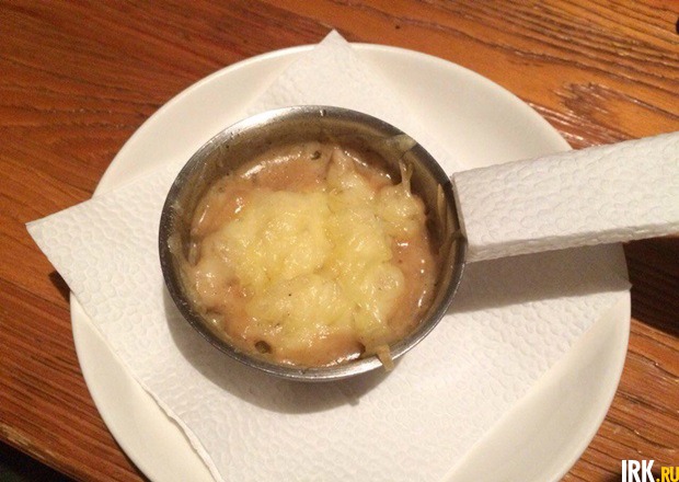 Блюдо представляло собой лосось, запеченный в фольге с картофелем, помидором, шампиньонами, луком и сыром. Кубики лосося, заправленные майонезом, сразу напомнили мне столовскую еду. Я вообще против использования готового майонеза не то что в ресторанах, но даже и дома. Лосось был пресным. Но если его вкус хотя бы немного оттеняли помидоры, то такой же пресный картофель был безнадежен, вдобавок оказался сырым и хрустел на зубах. Блюдо, как и большинство перечисленных выше кушаний, осталось наполовину нетронутым.