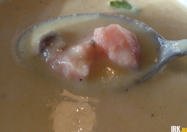 Суп подали в 13:58. К этому моменту я уже фактически написала первую часть обзора и просмотрела ленты всех соцсетей. Дарья поставила передо мной тарелку, спросила, может ли она забрать «Оливье», я кивнула. Удивило, что официант даже не поинтересовалась, почему уносит фактически нетронутое блюдо. Но сразу отпустила эту мысль, потому что попробовала так называемую уху. В жидком бульоне помимо мелких ворсинок картофельного пюре плавало 8 кусочков клейкой пересоленной красной рыбы, название которой я даже не смогла угадать. Бульон имел приятный оранжевый оттенок от моркови, в нем я обнаружила несколько черных точек, очевидно, являвшихся черным перцем. Но на вкус этот перец – и вообще что-либо еще – никак не проявлялся. Просто вяленький привкус рыбы – ни сливок, ни специй. Более грустного и пустого супа я еще не пробовала. Почему эта жидкость называется кремом? Почему ухой? Не уверена, что сотрудники кафе сами это знают.