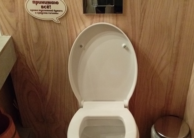 Вспомнился разговор с гардеробщицей на входе, она сообщила, что народу в заведении обычно маловато. Оглядевшись, я не нашла в этом ничего удивительного. Более или менее любопытным в кафе можно, пожалуй, назвать только туалет. Шишки на полу, березовые дровишки на полке, говорящий унитаз, который «принимает все» почти — очень мило и остроумно. Еще есть наклейка на зеркале, призывающая к «сладкому селфи», антистатик, грязный ролик для чистки одежды, губка для обуви и ужасающая пыль на полке с полотенцами.