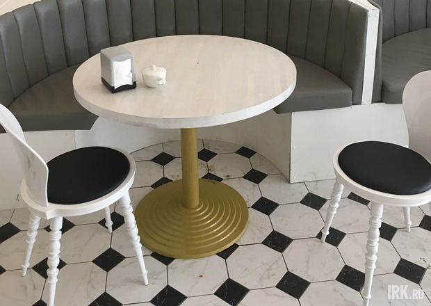 Сдержанно и стильно выглядят столики у окна, рассчитанные на двоих, но те, что расположены вдоль стен, опять же, ввергают в недоумение: почему под скамейками-сидениями просто не оставили пустоту? Её зачем-то загородили тонкими то ли пластиковыми, то ли дэвэпэшными панелями. Белыми! Конечно, с учётом того, что город у нас, прямо скажем, грязный, они все в разводах и царапинах от обуви и к тому же гулко гремят при каждом неловком ударе ноги. Такой же белый пол — в разводах.