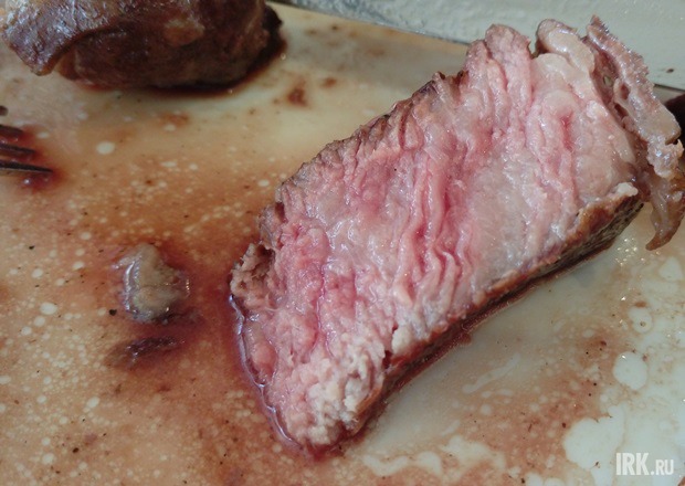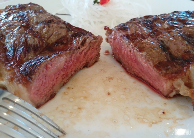 Цена на мясо с момента моего первого посещения несколько выросла и даже перестала указываться. Я сначала обрадовалась, увидев надпись «520 рублей» напротив стейка «Нью-Йорк», а после пригляделась: «за 100 грамм». Уточнила у Екатерины, какова будет примерная стоимость моего куска мяса. «Наверное, где-то 1500-1700 рублей…» — предположила я. «Даже где-то 2000 рублей,» — ответила Екатерина. Мой профессиональный интерес в очередной раз поборол жадность, а вместе с ней и здравый смысл, к тому же, как уже заметила в начале статьи, я чувствовала себя виноватой перед этой позицией в меню.