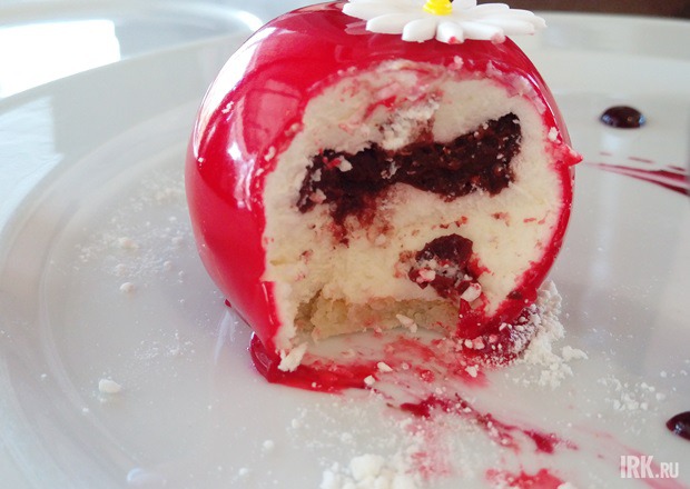 Нежнейший сливочный мусс со свежим и необычным для десерта вкусом базилика прекрасно дополнял яркое сочетание клюквенного пюре и шоколада в серединке. Лакомство не было приторным, сладость ему придавала только оболочка, поэтому и елось оно легко, приятно. Ещё не доев десерт, я уже хотела заказать его снова.