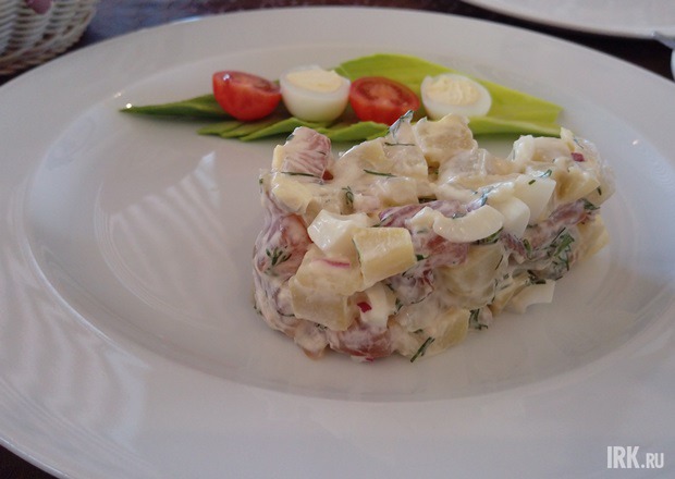 Знаете, салат можно назвать неплохим, если закрыть глаза и представить лето, дачу, бабушку, которая наскоро нарезала картошечку в мундире со свежим укропом и малосольной рыбкой. Но если прийти в себя и вспомнить, что напротив этого блюда указана цена 200 рублей, а картошка холодная не потому, что стояла в кастрюле в тенёчке, а потому, что ее не потрудились заранее достать из холодильника. И хрустит она не потому, что родная бабуля спешила, а потому, что повар, получающий за приготовление блюда зарплату, напутал со временем варки. Рыбка вкусная, нежная и упругая, но ее — и в целом всего салата — было мало до смешного. А дижонской горчицы, указанной в ингредиентах, я не обнаружила вовсе.