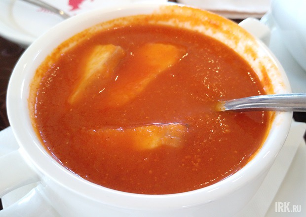 В меню напротив названия супа проставлен значок — два перчика. Обычно он говорит о том, что блюдо очень острое. Я не фанат жгучей еды, но этот суп даже умеренно острым не назову. А вот фанаты как раз возмутились бы и потребовали перечницу. Три с половиной кусочка варёного окуня были приятными на вкус, нежными и сочными. Но сам бульон, естественно, приготовили не из свежих помидоров, а из томатной пасты. Возможно, приправь повар блюдо как следует, оно вышло бы гораздо интереснее. Но после того, как я расправилась с последним кусочком рыбки, доедать большую часть кислой концентрированной густой жижи не было никакого желания.