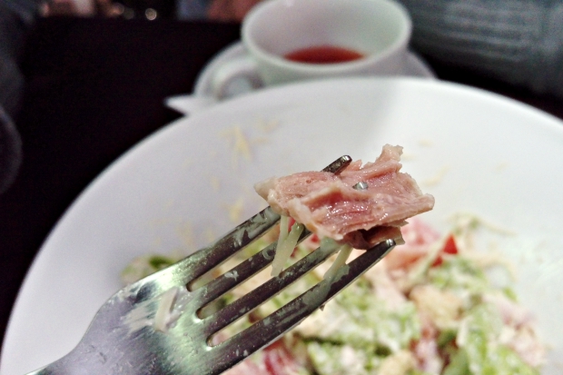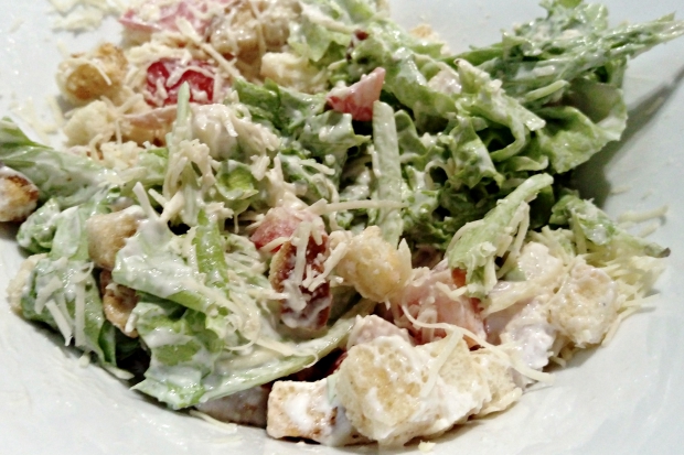 При перемешивании салат хлюпал и причмокивал: соуса не пожалели, и это было бы прекрасно, не напоминай он так майонез, причем майонез лёгенький такой, даже не «Провансаль». Замечанием этим можно было начать и закончить описание блюда, но я всё же отмечу, что и прочие ингредиенты салату не помогали: листья размякли так, что даже не хрустели; «твердые сыры» ощущались как один вид сыра, причем не очень и твёрдый; куриное филе почему-то было копчёным; «фирменные гренки» — мелко порезанный и подсушенный естественным образом батон.