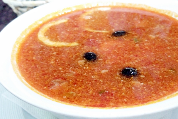 Можно было делать выводы о блюде, даже не пробуя. По кислотному цвету поняла, что здесь перебор с томатной пастой. Жидкий бульон не обещал никакой наваристости и ярких мясных вкусов, густую белую массу при перемешивании раздробило на несколько мелких кусочков: здесь не сметана — майонез. Или, простите, тут это называется «фирменный соус „Цезарь“».