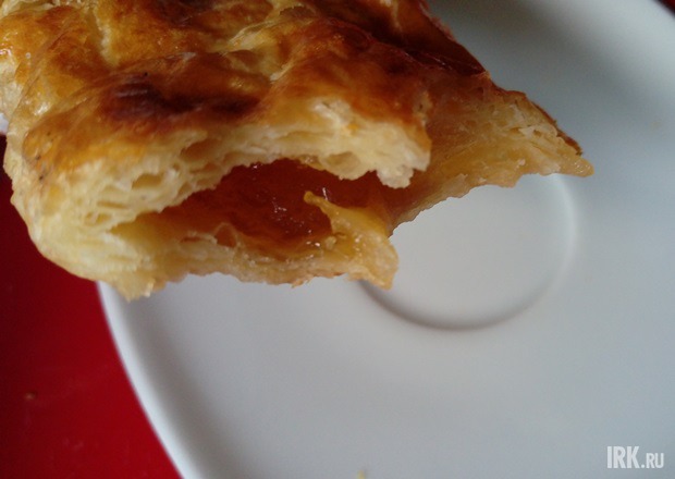 Сильно деформированное и вялое состояние выпечки сразу подготовило к тому, что наслаждения от свежего десерта я не испытаю. И действительно: приплюснутый слоёный пирожок был жирным, даже каким-то неприятно и маргариново жирным, зато вполне добротно наполнен яблочным джемом. Тоже съедобно, ну так… На троечку.