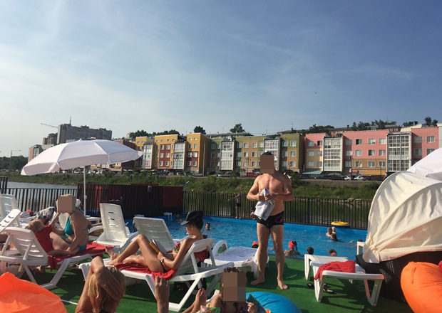 Но оказалось, что «Крылья» мне знакомы: зимой на этой площадке был один из самых популярных развлекательных городков с горками, катком и прочими развлекалками. Летом же на понтоне выстроили что-то вроде барной зоны с бассейном. Да-да, всё, как мы видим в любом «Форсаже»: музыка, коктейли, брызги и много, много девушек в купальниках. Правда, выяснилось, что большая часть этих прекрасных девушек в купальниках — с детьми. Но ведь, как говорилось в старом шовинистическом анекдоте, «если я на диете, это не значит, что я не могу смотреть меню». Ну и меню — без всяких анекдотов — надо было посмотреть в любом случае, ведь я пришёл не только за эстетическим удовольствием, но и за гастрономическим. Если повезёт.