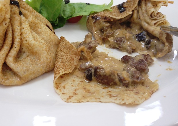 Это была рубленная (почти как в хушурах) говяжья вырезка в обилии густого сливочно-лукового соуса, обернутая в нежнейшие блины. По-домашнему вкусно получилось – так и хотелось урчать от удовольствия. Собственно, я так и делала, пока передо мной по стойке «Смирно» не вырос Илья с последним горячим блюдом.