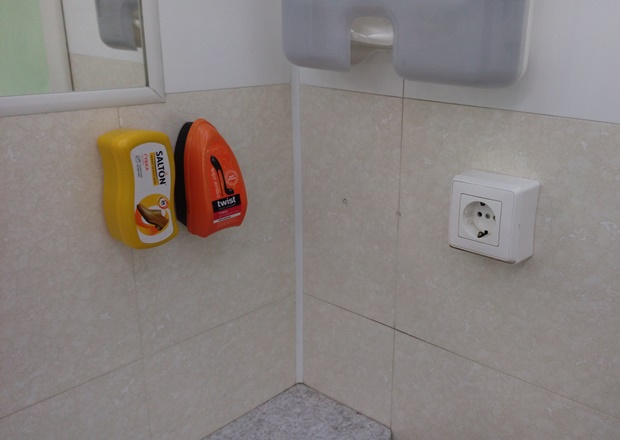 В туалете чисто и забавно. К стенам приклеены (а кое-где оторваны и лежат рядом) футляры с губками для обуви. Под раковинами стоят большие глубокие корзины, предназначенные для того, чтобы выбрасывать в них мокрые махровые полотенца для рук. Вот только сухих чистых полотенец я нигде не нашла. Прямо в кабинке на крючке висят плечики. Наверное, они для тех гостей, кто в холодное время года забегает сюда прямо в шубе. Или как раз для таких, как я (кто смущается, что пришел в джинсах), здесь раньше висело вечернее платье. Но кто-то меня опередил.