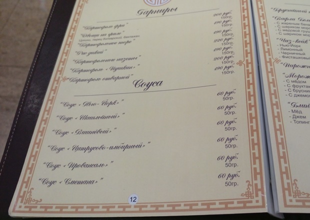 Одна страница меню посвящена «бою посуды» — можно побаловать себя после тяжелого рабочего дня чашечкой-другой. Поражает, удивляет и крайне обескураживает раздел «Соуса». Вообще меню изучала долго, потому что каждой категории блюд уделено как минимум две страницы; кухня бурятская с крупными такими вкраплениями европейской. Проще говоря, здесь есть всё, кроме роллов и тирамису. Кое-что в меню и вовсе ставило в тупик, например, сокращённые названия ингредиентов, такие как «гор. кофе» (в напитке «Мадам кофе» должен быть) — попыталась уточнить у Ильи, что это. Илья не знал, пошёл выяснять к человеку за столиком на входе. Вернулся.