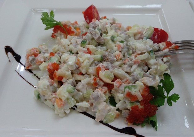 Обычно, если традиционный рецепт блюда освежают, то некоторые привычные ингредиенты уступают своё место новым. Например, вместо отварной говядины кладётся курица, а вместо картошки — яблоко. И салат воспринимается по-другому. Но мне принесли советский вариант салата «Оливье», где и так ингредиентов много: морковь, картофель, огурец, яйца, говядина, горошек — плюс, добавили курицу с яблоком, красную икру и помидор. Ингредиенты мелко покрошили (кроме зелёного горошка) и хорошенько сдобрили майонезом.