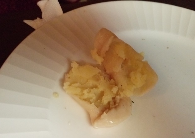 Плотное тоненькое тесто, ароматная зелень, вкусное картофельное пюре внутри… в которое забыли добавить шкварки. Впрочем, мне уже было не до них. Я наконец-то дождалась съедобное блюдо и умяла его с удовольствием: вдруг повар не в настроении испортит и лососину.
