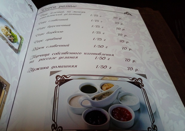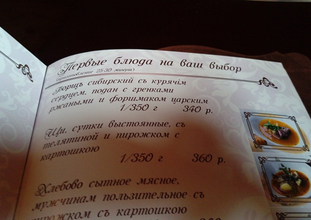Меню было то же, что четыре года назад. Во всяком случае, я нашла в нём все позиции, о которых писала в стареньком обзоре. И, раз уж у меня «ностальгии статья», решила, что называется, повторить и заказать всё, что пробовала тогда: морс, сагудай, салат «Цесаревич», салат с ростбифом, борщ сибирский, хариус с овощами, медовик и пирожки.