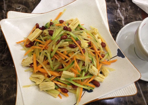 Стандартный набор ингредиентов могла скрасить только правильная заправка — растительное масло, светлый рисовый уксус, кунжутное масло, сахар, немного соевого соуса и различные добавки (умами, маласянь, смесь пяти специй и т.д.). Но, увы, надежда не оправдалась. Все ингредиенты были просто немного приправлены растительным маслом и уксусом и в сущности остались пресными.