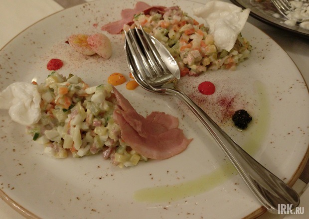 Лёгкий домашний майонез обволакивал аккуратно нарезанные овощи (свежие и маринованные огурцы, морковь, картофель) яйца и утку. В целом вроде и неплохой оливье, но он категорически не вызывал у нас интереса. До традиционного новогодне-домашнего блюдо не дотягивало – не хватало горошка и лучка. До истинного, того, что с рябчиками и раками, кхм – сами понимаете, что далеко. Как новое самостоятельное блюдо это оливье не воспринималось тоже — копченая жирненькая птица была слишком слаба, чтобы вытянуть этот салат. «Тройка», особенно учитывая стоимость.