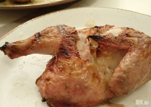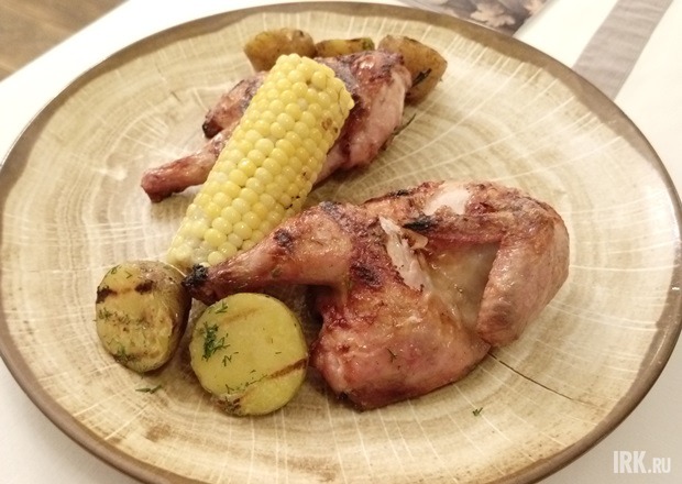 Дым рассеялся — цыпленок остался. Опять вокруг разделенной надвое птицы что-то из кукурузы и картофеля нашаманил мне в тарелке повар. Ну, он так видит. На вкус хорошо: перчено-розмариновая хрустящая шкурка и горячее нежное мясо. Если б оно еще легко отделялось от кости, я бы вообще назвала его идеальным. А так — все равно «пять», но с минусом.