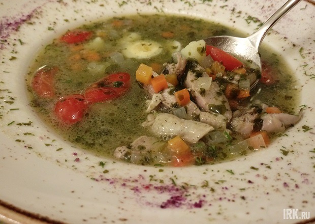 В супе много зелени, картофель, морковь, перепелиное яйцо, лук и практически свежие помидоры. То, что там была перепелка – легкое упругое мясо — конечно, придавало блюду некоторую изысканность. Но в целом – опять весьма посредственно.