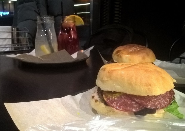 Все меню Beef box умещается на одной страничке: тринадцать видов бургеров на выбор, скромный набор салатов — «Греческий» и «Цезарь» — картошка, напитки. Спросила девушку-кассира про состав разных бургеров. В ответ она подняла указательный палец вверх, мол, все подробности под потолком. Я приметила бургер с «блю-чиз сыром», а мой спутник взял Mama Italia («Мама Италия»). На закуску прихватили картошку-фри с соусом из томатов, белых грибов и бекона, два лимонада (классический и ягодный), безалкогольный глинтвейн.