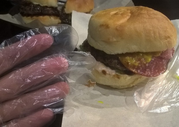 Бургер принесли быстро — не прошло и десяти минут с момента заказа. К бургерам прилагались перчатки, большие и похожие на те, что идут в наборе с краской для волос. Мне это показалось неудобным — руки в них просто утонули. Мой спутник, наоборот, счел их практичнее резиновых. А вы что думаете?