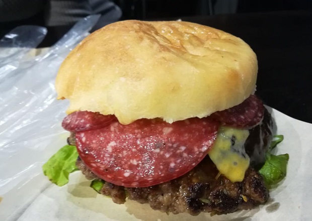 Этот бургер в разрезе, если не обращать внимания на булки, выглядел приличнее предыдущего. Внутри все те же карамелизированный лук и лист салата, котлета, сыр чеддер, салями и пепперони. Все полито итальянским соусом и (опять невесть откуда взявшейся) горчицей — хоть тут ее было поменьше, спасибо. Весь вкус этого бургера сосредоточился в тонко порезанной, чуть острой колбасе. Очень хотелось попросить у поваров вилку с ножом, отложить в сторону булки и с удовольствием съесть мясную часть. Бургер получает «четверку» только за мясо.