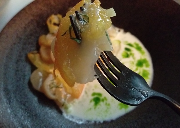 Маринованный гребешок с яблочным желе, хурмой и соусом из ряженки и хрена, 350 рублей