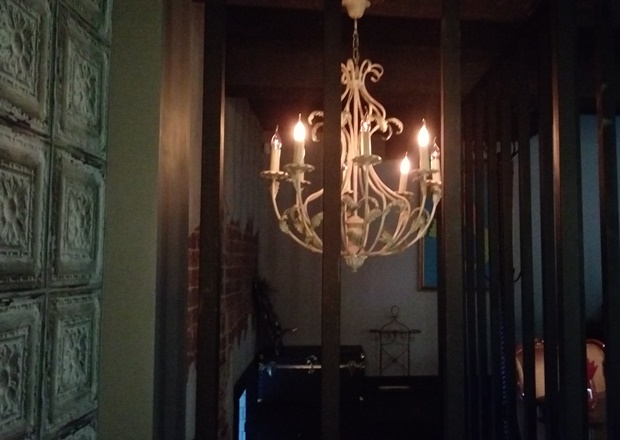 Несмотря на то, что основная «движуха» происходила на первом этаже, нас потянуло на второй, где было тихо и уютно. Интерьер непрозрачно намекает на первое заведение сети — очень похожая обстановка в «Молчанове», даже некоторые картины позаимствовали оттуда. Однако чувствуется, что «33» серьезнее: здесь более просторно и светло, больше внимания уделили отделке стен и полов, вазочки на столы поставили (пусть и не совсем с цветами), потолок без обрывков газет. И получился такой молчановский богемный беспорядок, но уже не «эгегей, падай, дружище, где место найдешь», а «добро пожаловать, присаживайтесь, что будете заказывать». Здесь даже кальянов нет, что меня удивило очень.