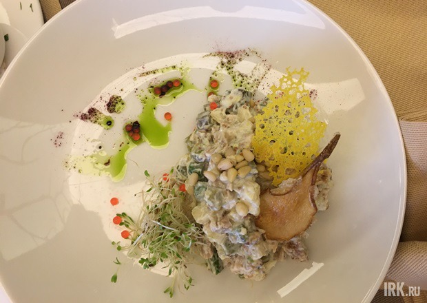 Тут и заправка в наличии, и милая посыпка из кедровых орешков, и умилительные ростки салата… Но тоже всё рассыпается. Авокадо (не лучший, кстати) отдельно, курица — самостоятельно, груша такая сладкая, что вообще забивает всё. Такая пицца от салатов получилась: всё, что было в холодильнике, свалили в чан, сметаной залили, перемешали, празднично украсили. В таком случае спасение языковых рецепторов — дело винной карты. Но я был за рулём, спасти их не удалось. Категория «Попробовал — и не стану повторять».