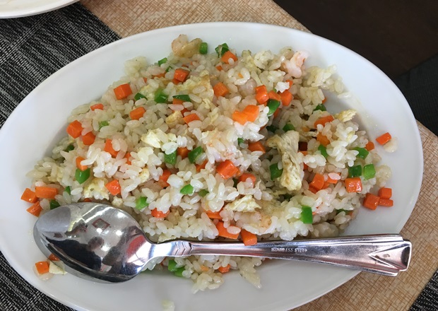 Вот к чему-чему, а к рису в китайском заведении нет претензий! То ли они его импортируют с родины, то ли повар тут точно не ошибается и знает тайный «ахалай-махалай», который бормочет над кастрюлей… В общем, дома так сварить его мне ни разу не удавалось — чтобы рис был одновременно рассыпчатым, но в тоже время чуточку клейким. С креветками, правда, напряжёнка: мало того, что их мало, так повар в каком-то исступлении покрошил их на мелкие кусочки величиной чуть больше рисинки. На вкус в силу своей микроскопичности они вообще никак не влияли. Тем не менее, я бы отнёс это блюдо к категории «Попробовал — и закажу снова»: рис сам по себе такой вкусный, что креветочный дефицит не омрачил впечатления.