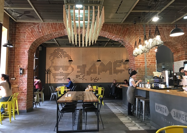 Внутри всё довольно минималистично, с намёком на всё ещё неведомо почему модный в Иркутске стиль «лофт». У окон — высокие узкие столы-подоконники с барными стульями, вдоль стен — диванчики со столиками, а посередине — вместительный и солидный стол на большую компанию. К слову сказать, в обеденное время больших компаний тут не наблюдалось, да и вообще не сложилось впечатление, что «Замес» не нацелен на такую аудиторию. Это быстропит, рассчитанный на работников окрестных офисов и прохожих, охваченных внезапным чувством голода в центре города.