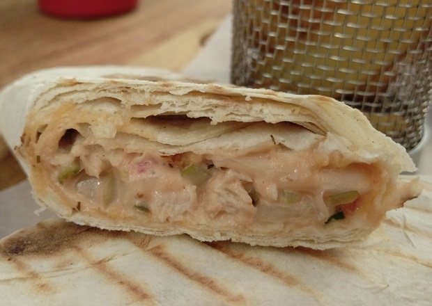 Очень понравилась лепешка, она прямо лучшая из всех, что я пробовала: поджаристая, тонкая, внутри мягенькая. Вместо сытного соуса — оливковое масло, плюс лучок, нежная курочка, лист салата, кедровые орешки и соус «Песто». От шаурмы здесь, пожалуй, только лаваш, но зато правда вкусно, рекомендую.