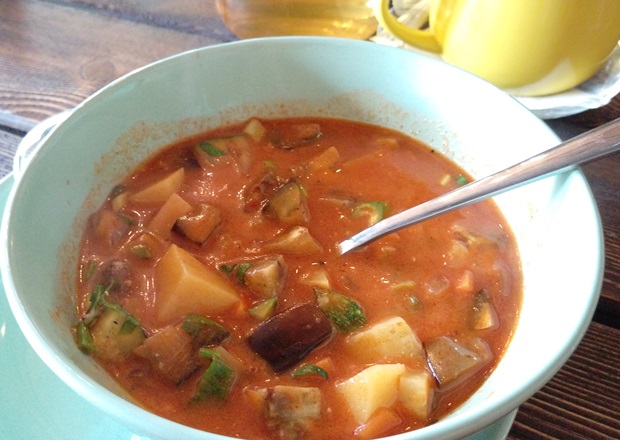 Вот все было в этом супе прекрасно: и яркий насыщенный и наваристый бульон, и не разваренные, немного даже похрустывающие цукини с баклажанами, картошечка, перец горошком, рядом свежая сметанка… Только все это было не гуляш, а овощной суп с возможными следами мяса. Мы нашли четыре кусочка. А вы знаете, да, что гуляш — это когда мяса побольше, да и всего остального, а бульон не просто густой, в нем практически ложка стоит, это даже не бульон, а соус скорее. В общем, весьма своеобразное прочтение рецепта.