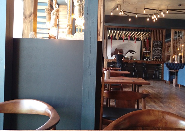 Во время обустройства кафе владельцы придумали еще одну зону — для фанатов сериала «Друзья». С камином, оранжевым диваном и милыми портретами актеров известного ситкома. И вот зона эта среди деталей в морской тематике показалась мне неуместной. Просто как островок из совсем другого ресторана, в который я, как поклонник Фиби, Чендлера, Джо и других замечательных героев, зашла бы тоже. Но смешение двух разных стилей несколько портит целостное впечатление от интерьера, лучше бы в этой зоне для больших компаний продолжили корабельную тематику. Впрочем, не могу сказать, что меня присутствие дивана прямо раздражало, помещение все равно кажется уютным.
