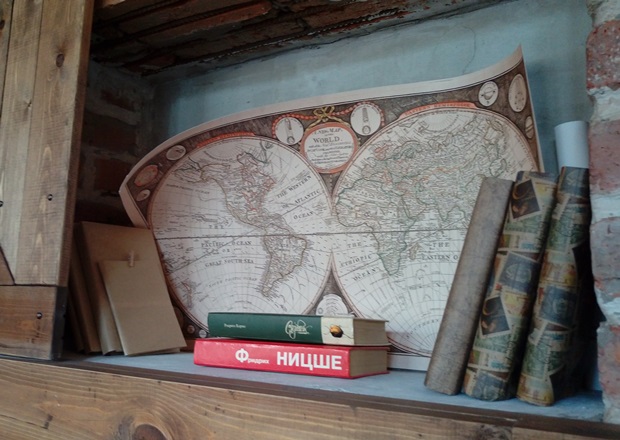 Однако настоящая «каюта» скрывается за плотными занавесками. Там комната с парой столиков и пианино, очевидно, для тех, кому уединение милее света белого — темновато показалось там с первого взгляда. Впрочем, я особо не успела разглядеть, как и сфотографировать (в зале мы с подругой были чуть ли не единственными гостями, внимание персонала полностью сосредоточилось на нашем столике).